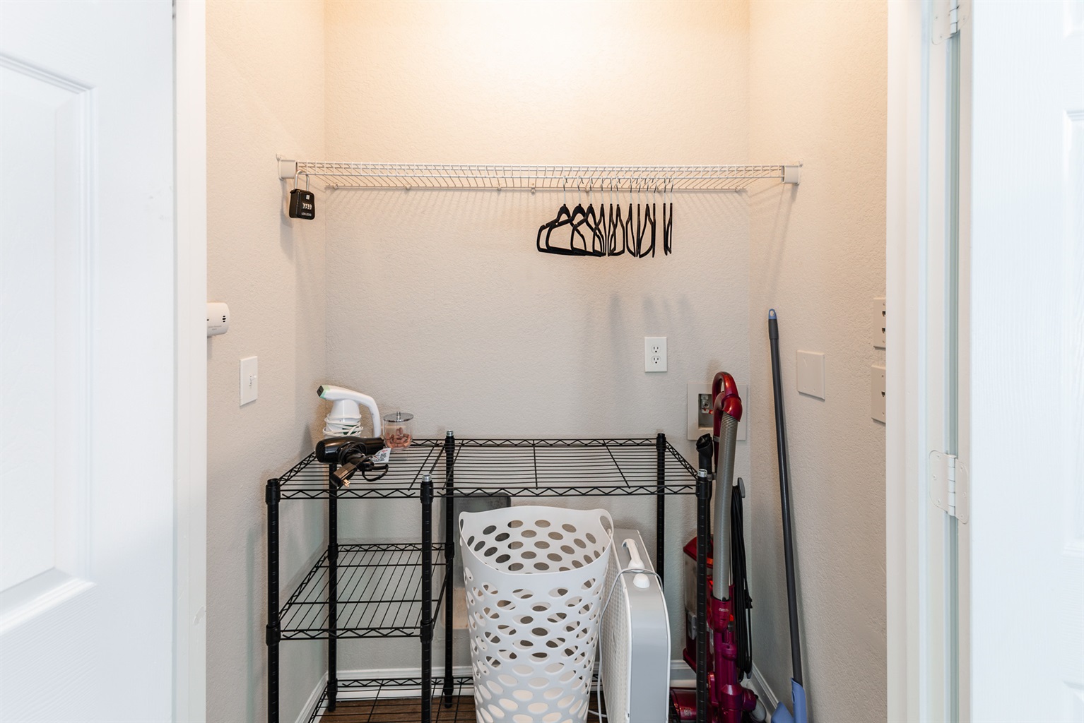 There is a hair dryer and clothing steamer in the wardrobe.